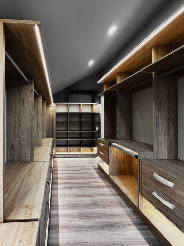 Надо было разместить гардеробную на довольно нестандартной площади и чтобы вмещалось как можно больше вещей.