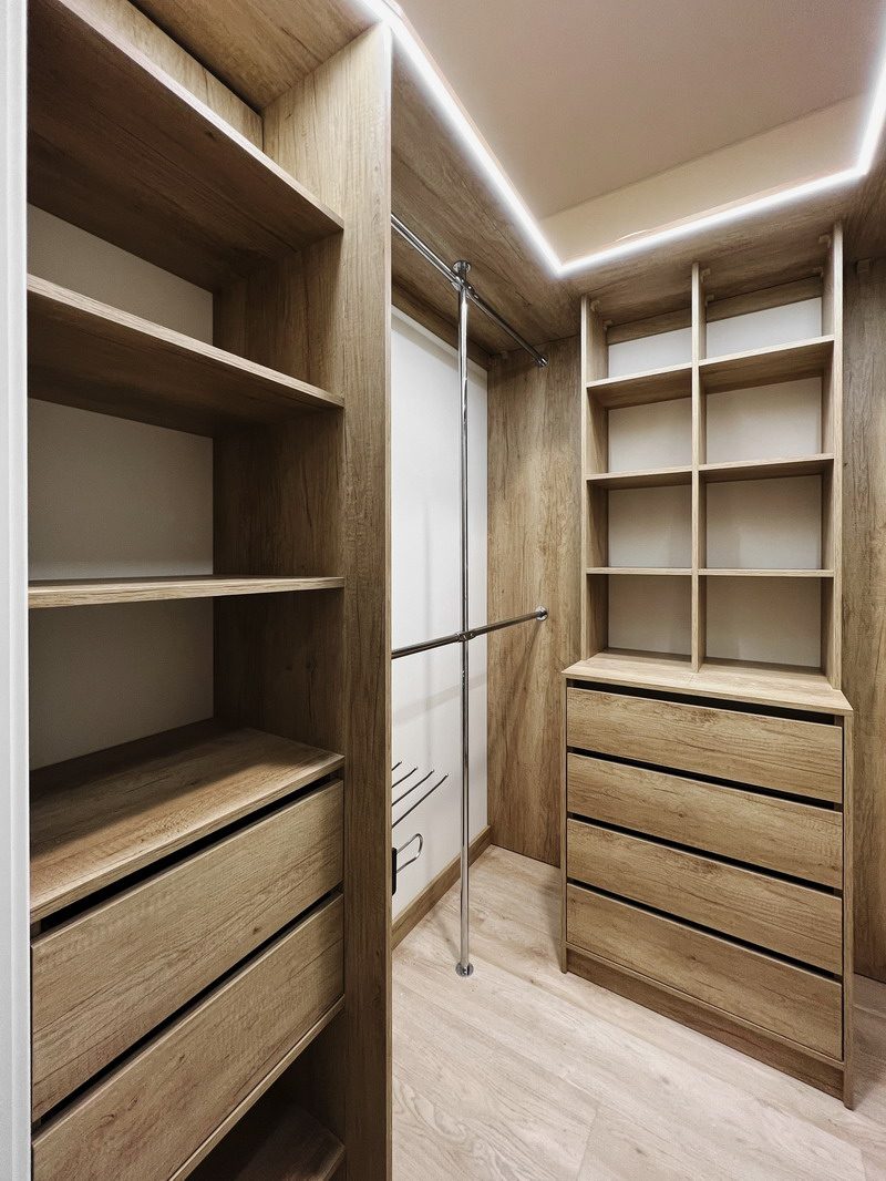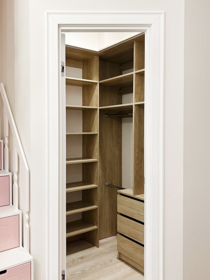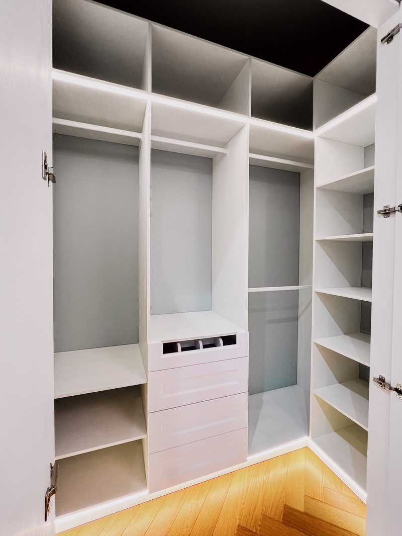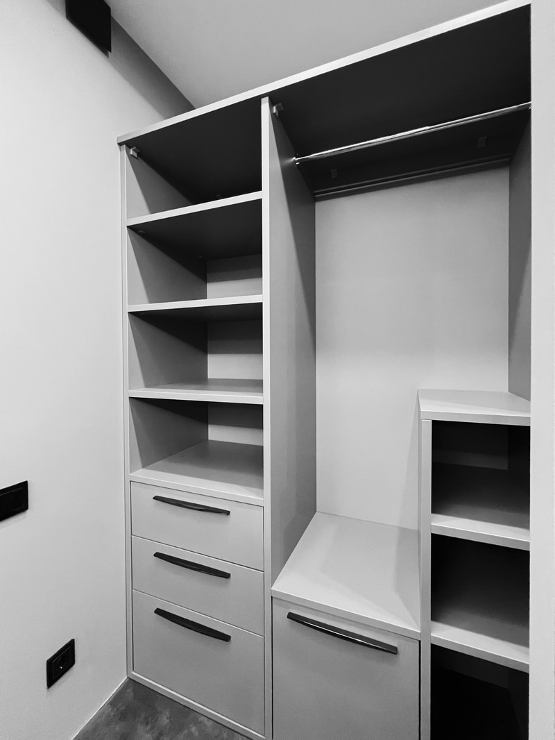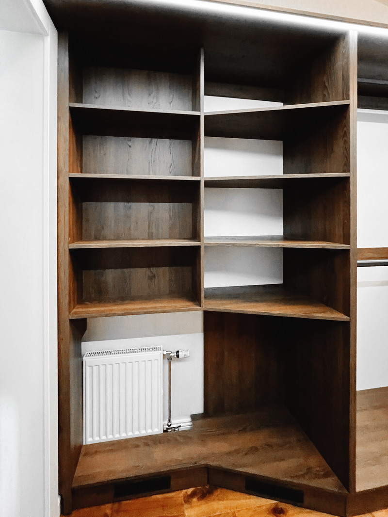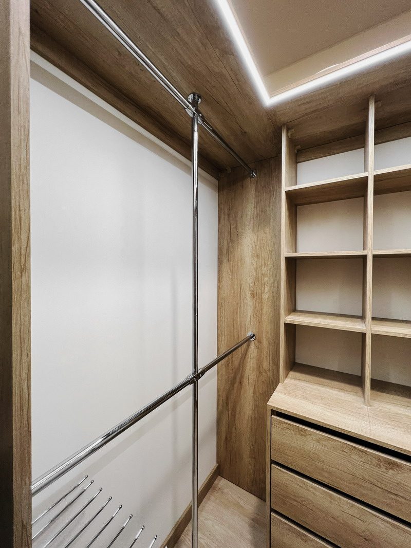Надо было разместить гардеробную на довольно нестандартной площади и чтобы вмещалось как можно больше вещей.