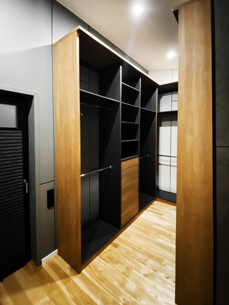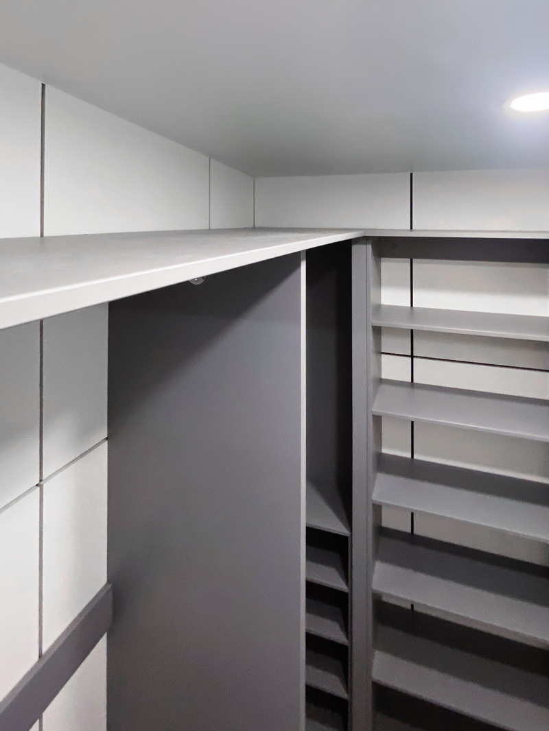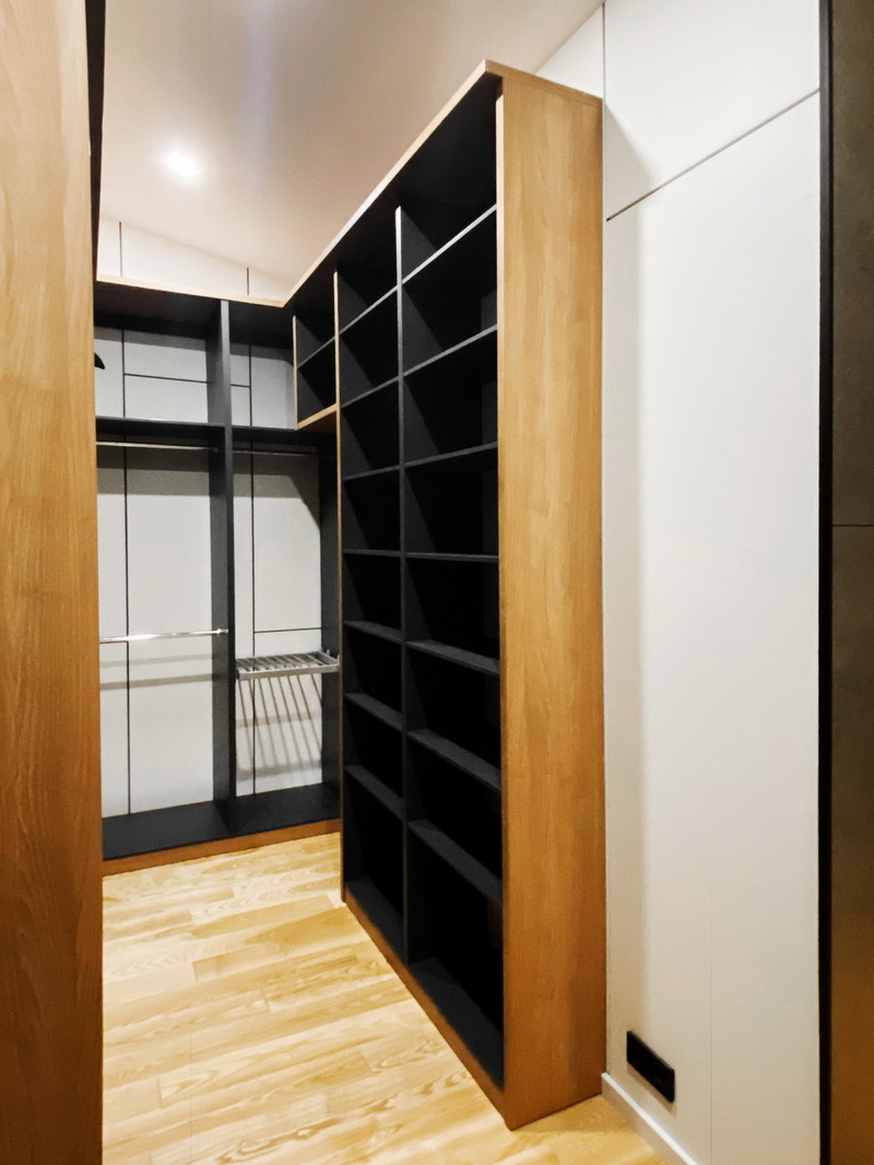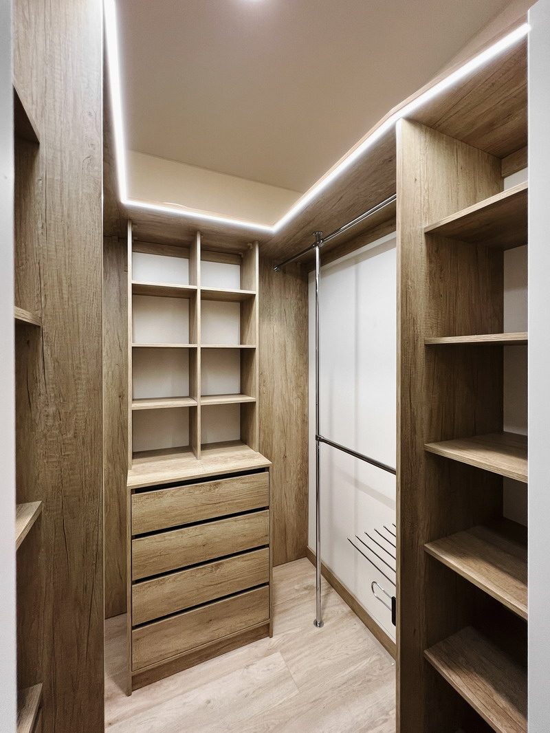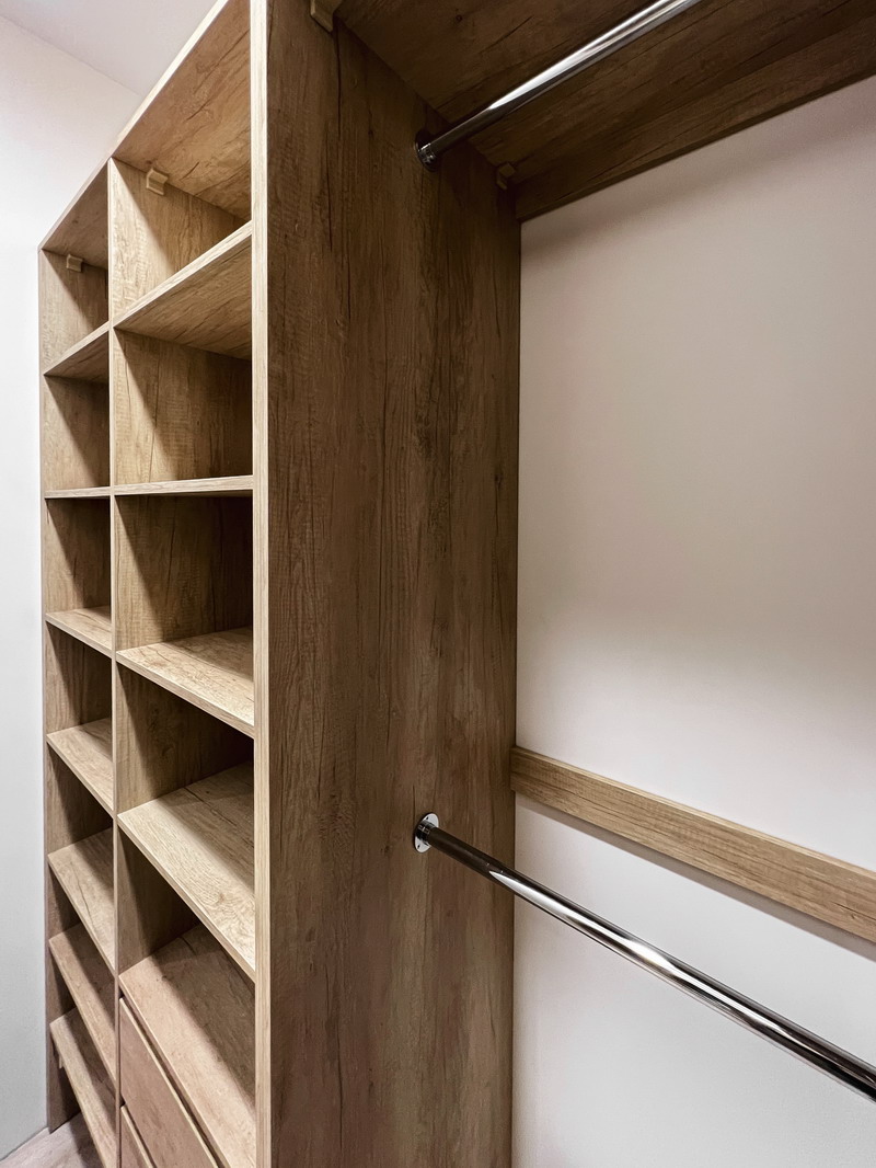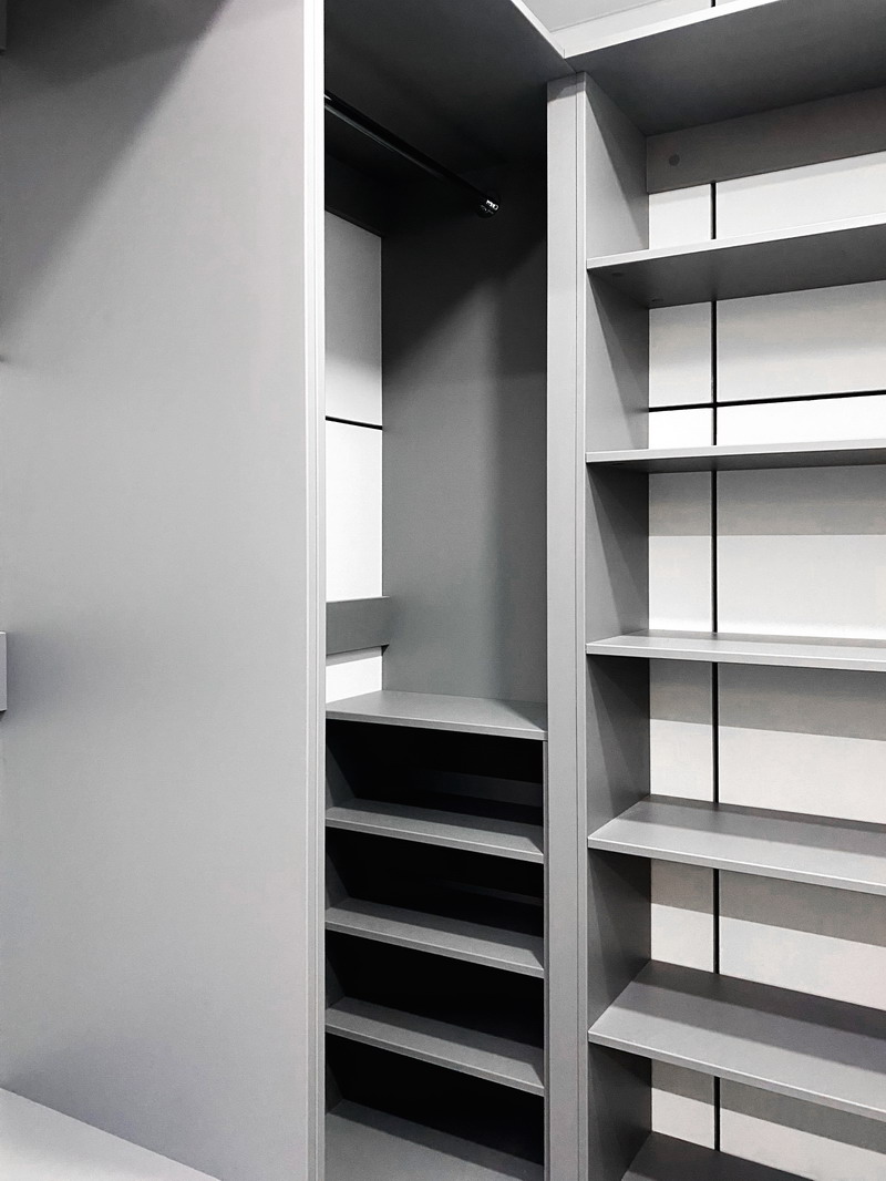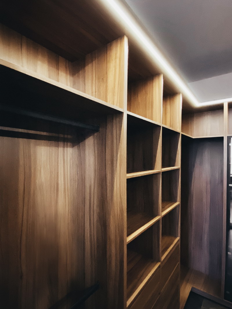Надо было разместить гардеробную на довольно нестандартной площади и чтобы вмещалось как можно больше вещей.