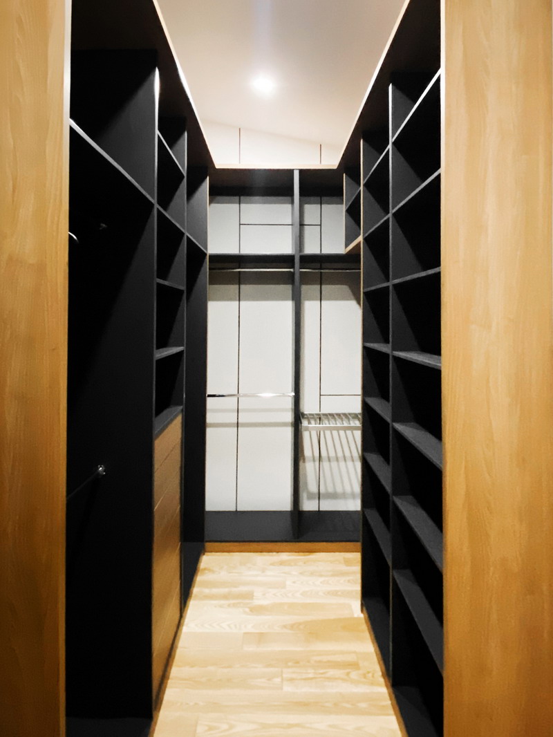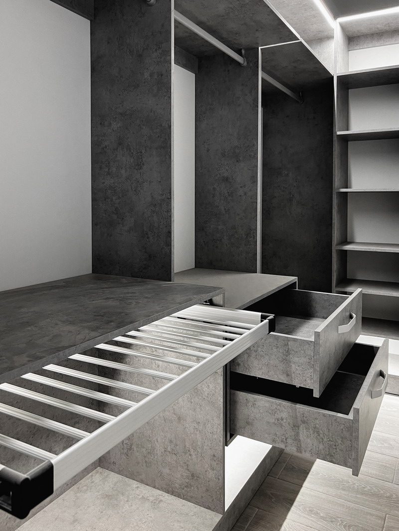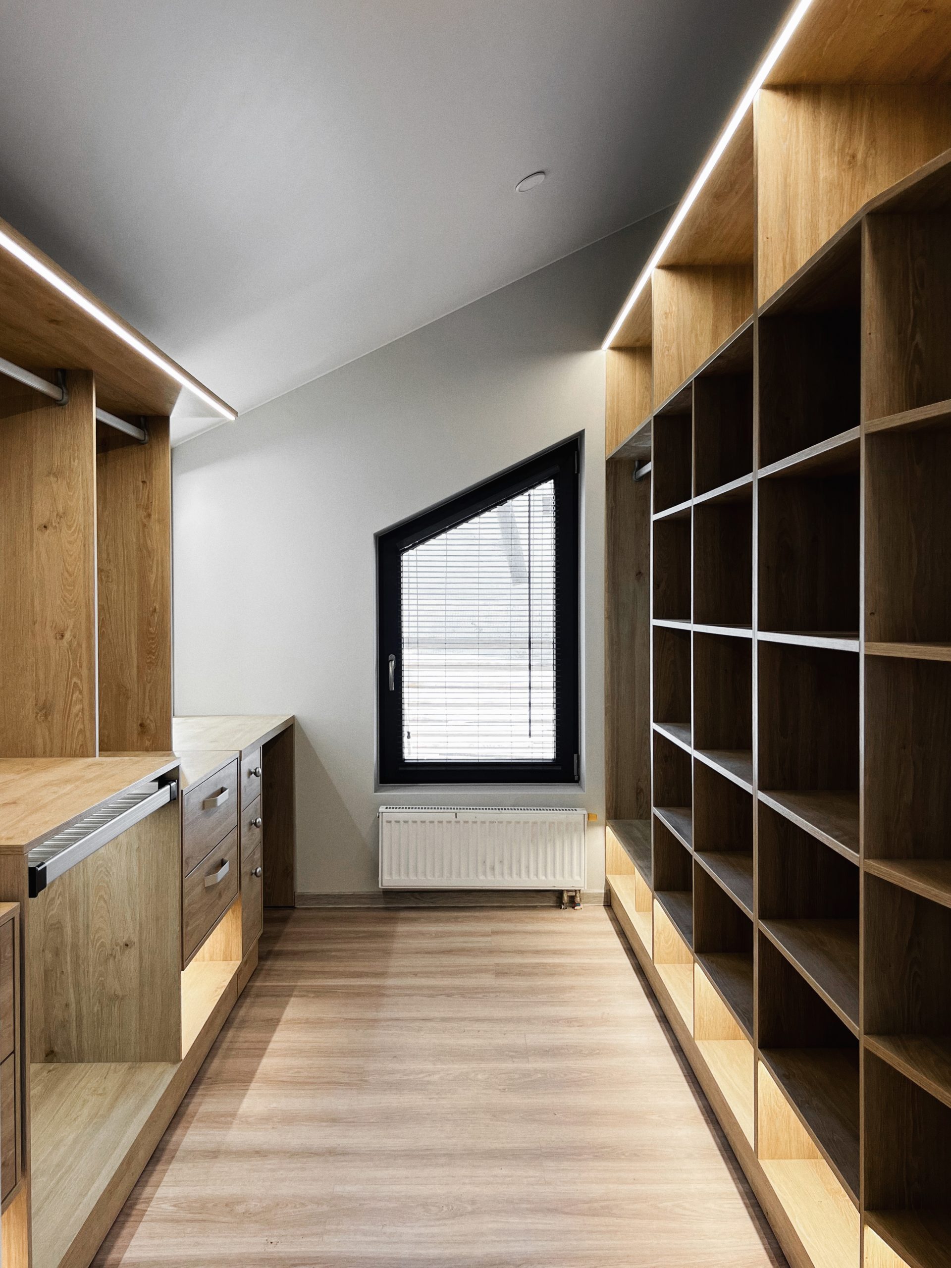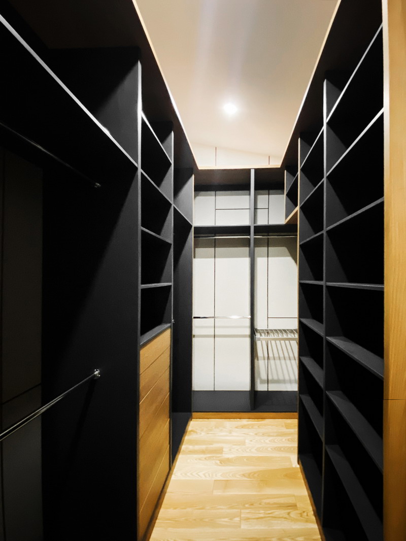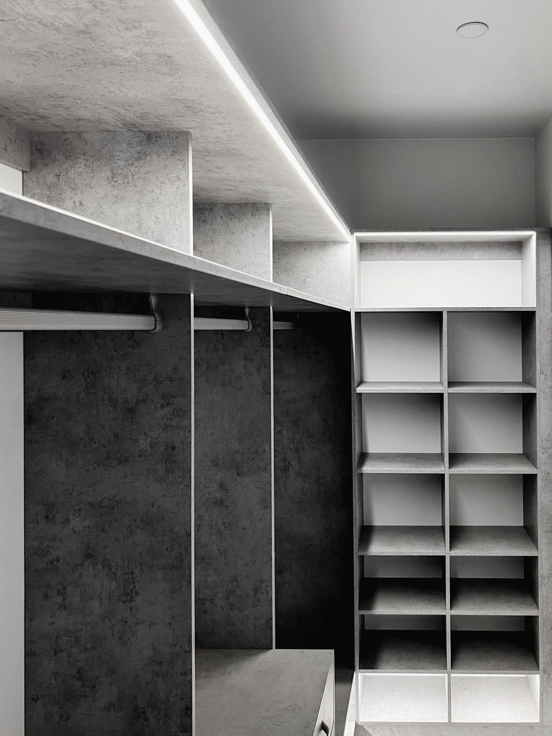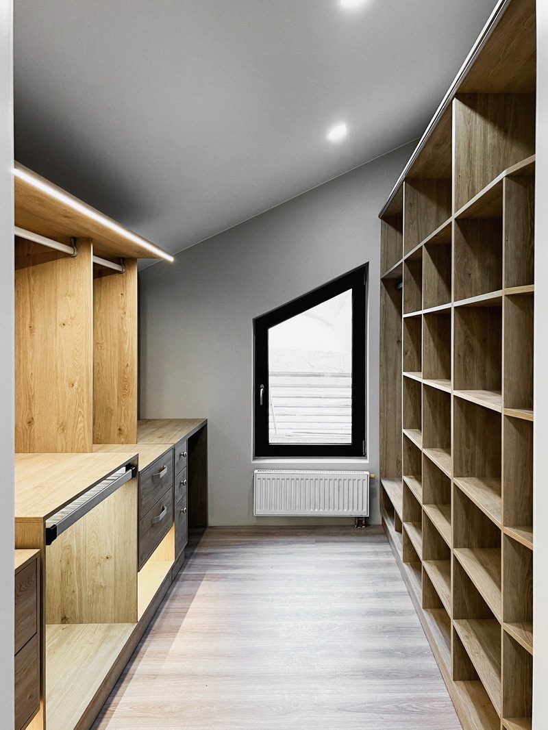 Надо было разместить гардеробную на довольно нестандартной площади и чтобы вмещалось как можно больше вещей.