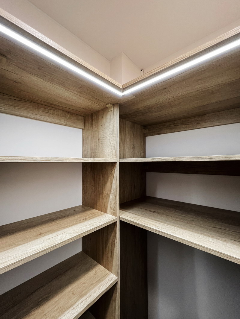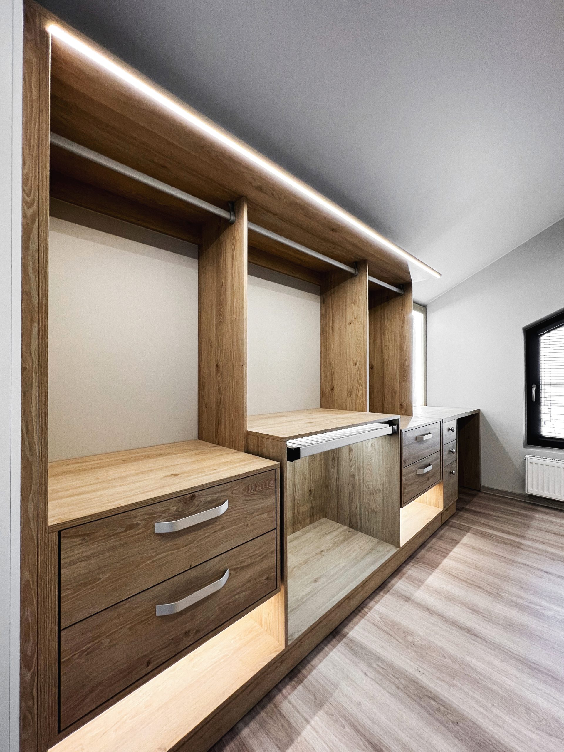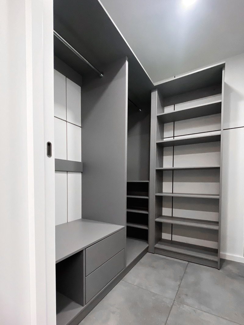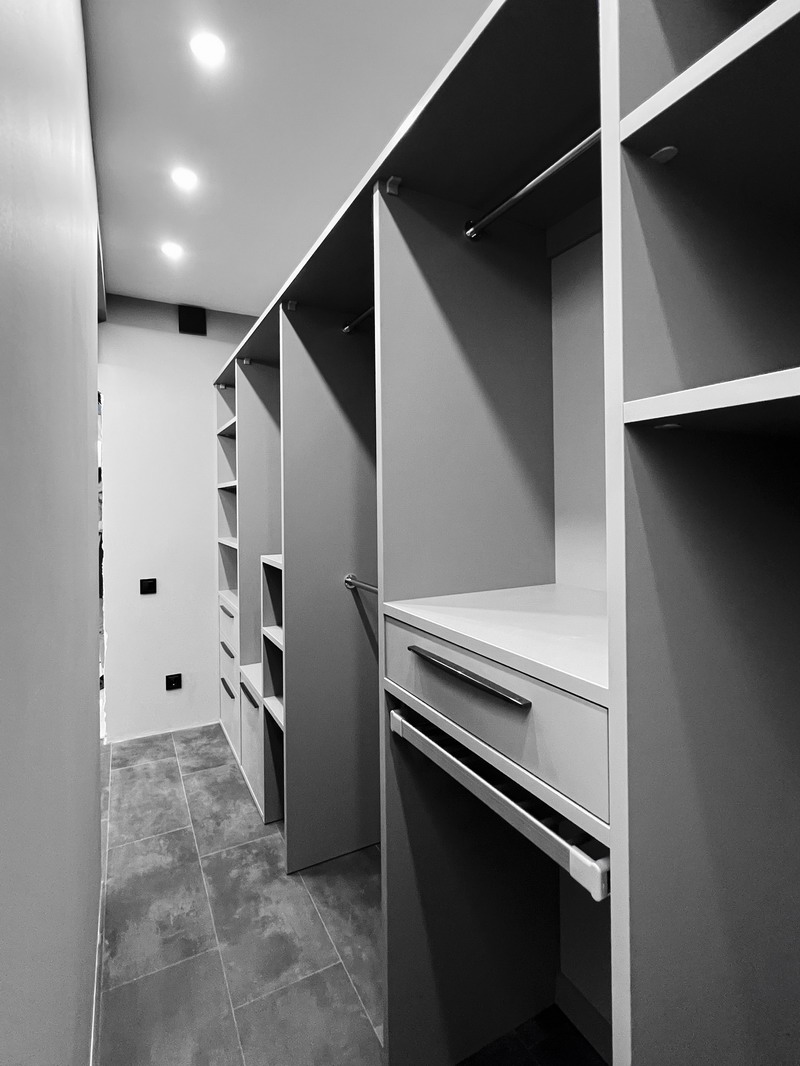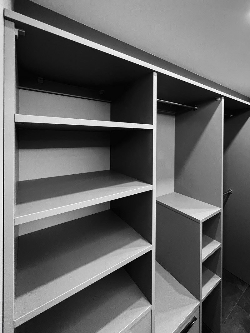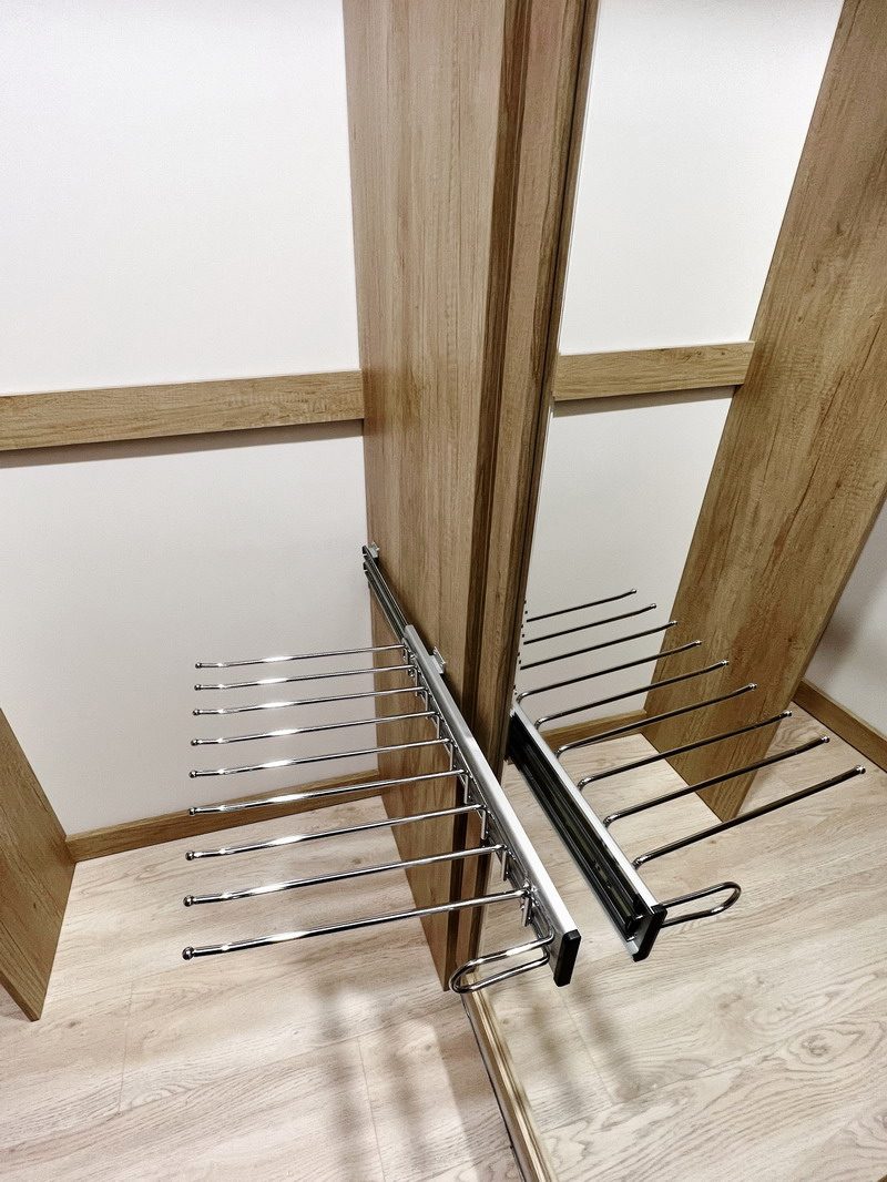 Надо было разместить гардеробную на довольно нестандартной площади и чтобы вмещалось как можно больше вещей.