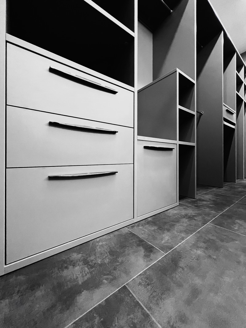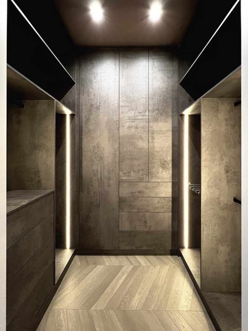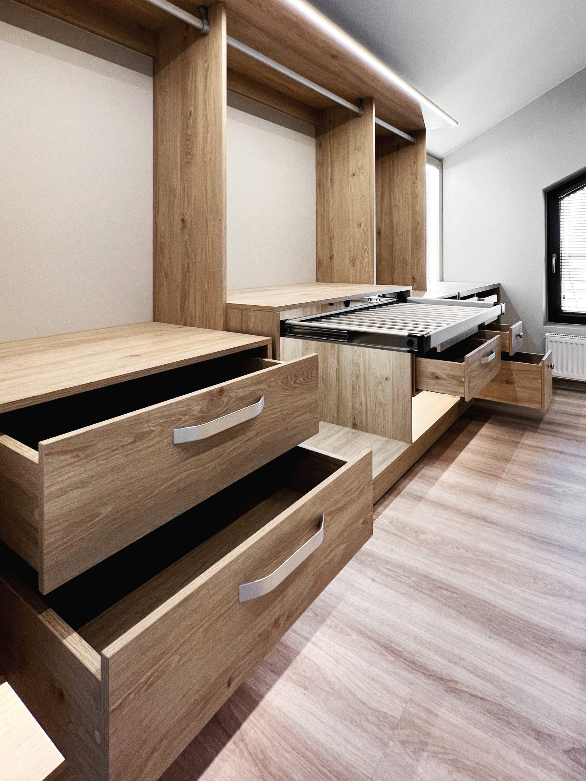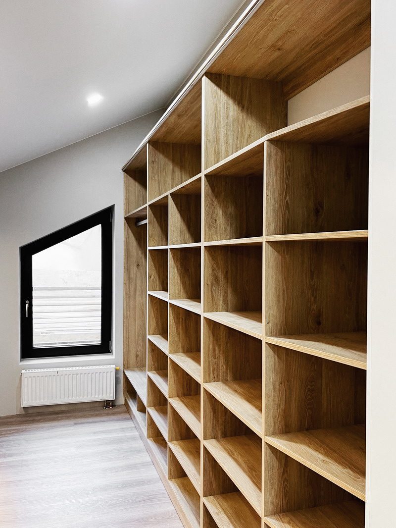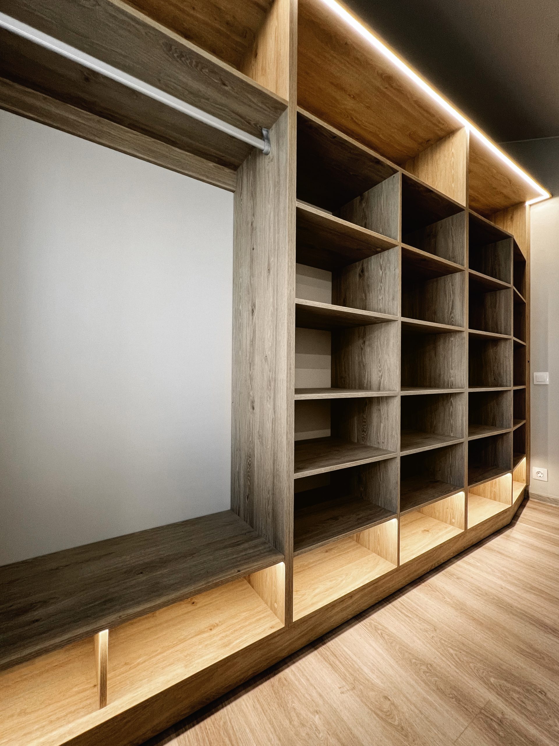 Надо было разместить гардеробную на довольно нестандартной площади и чтобы вмещалось как можно больше вещей.