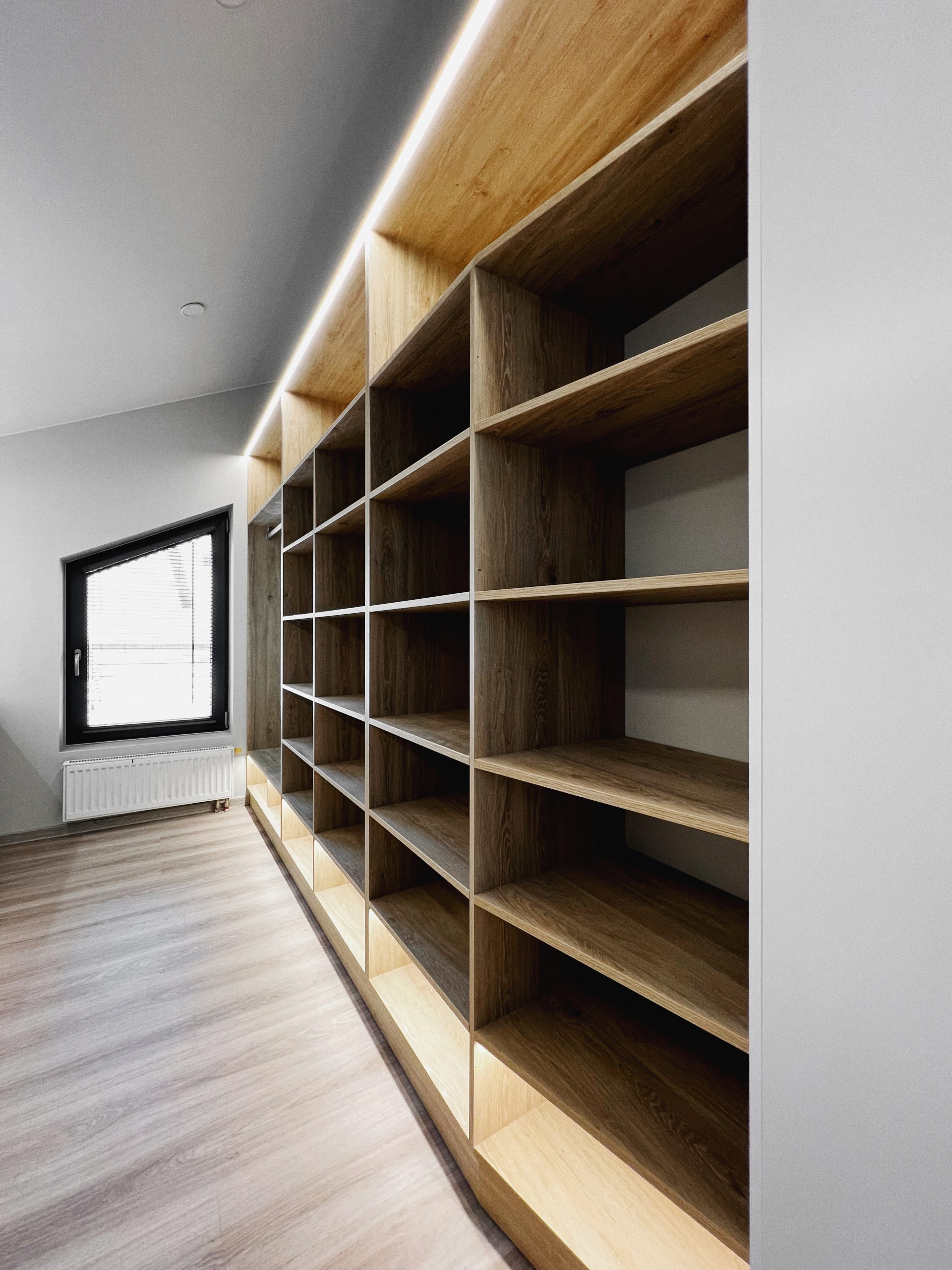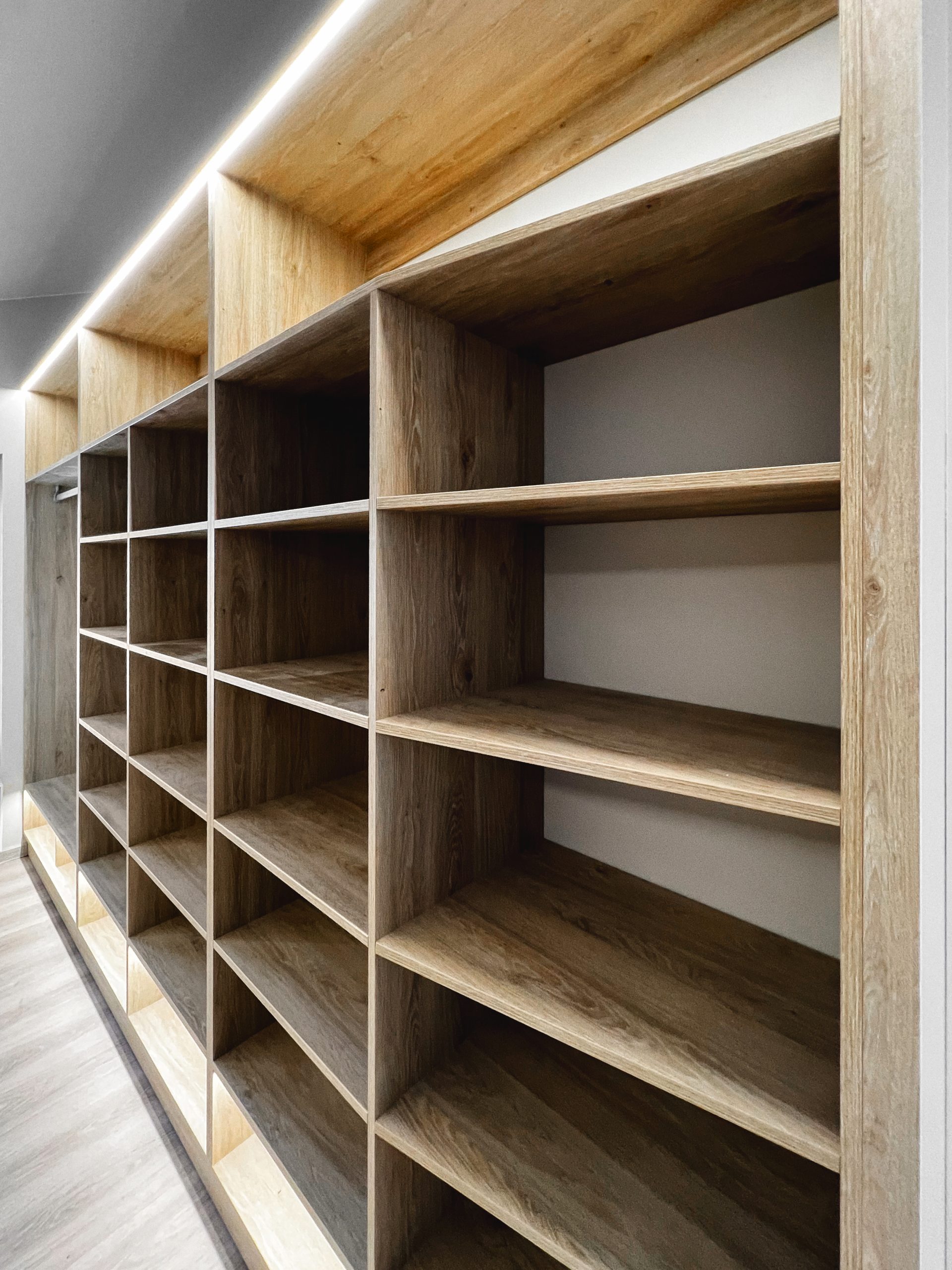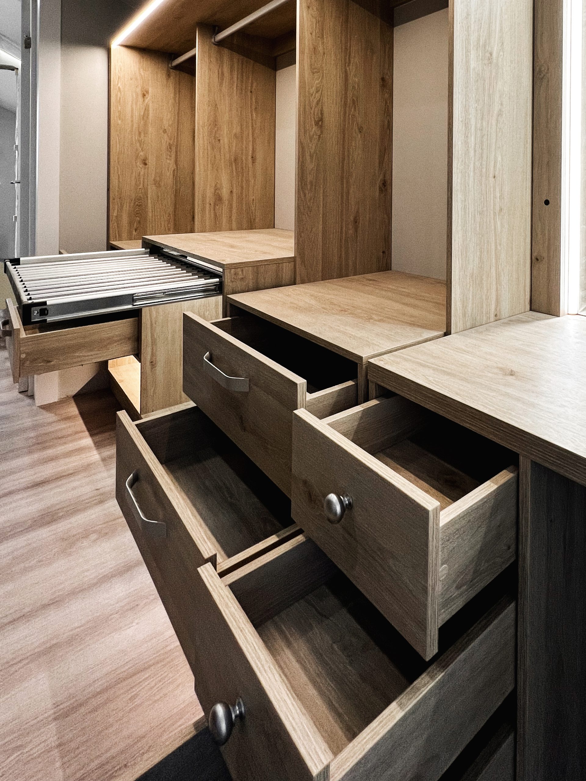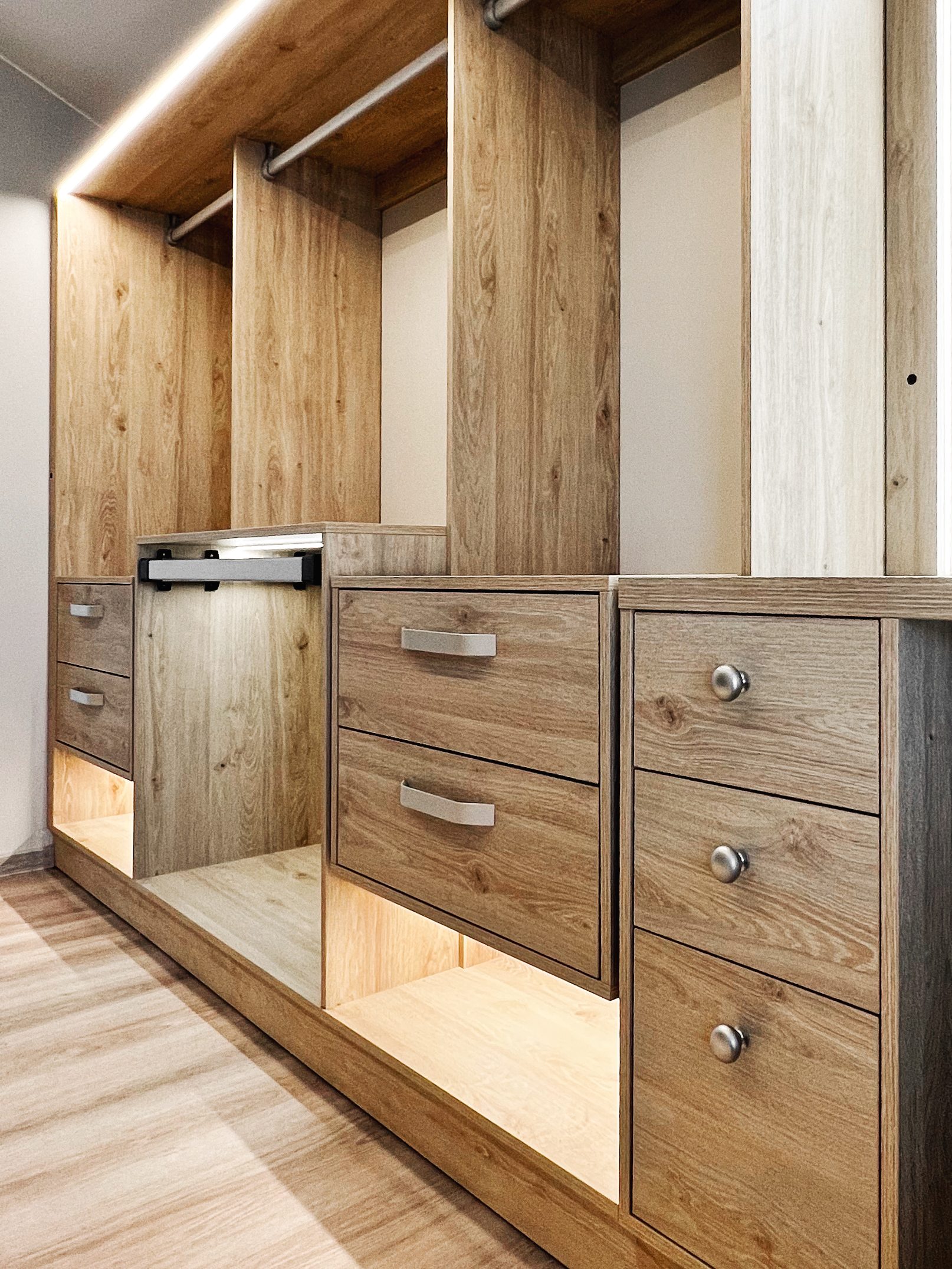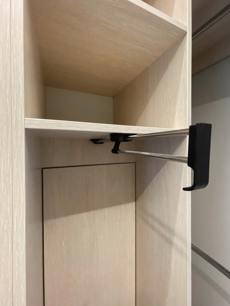 Надо было разместить гардеробную на довольно нестандартной площади и чтобы вмещалось как можно больше вещей.