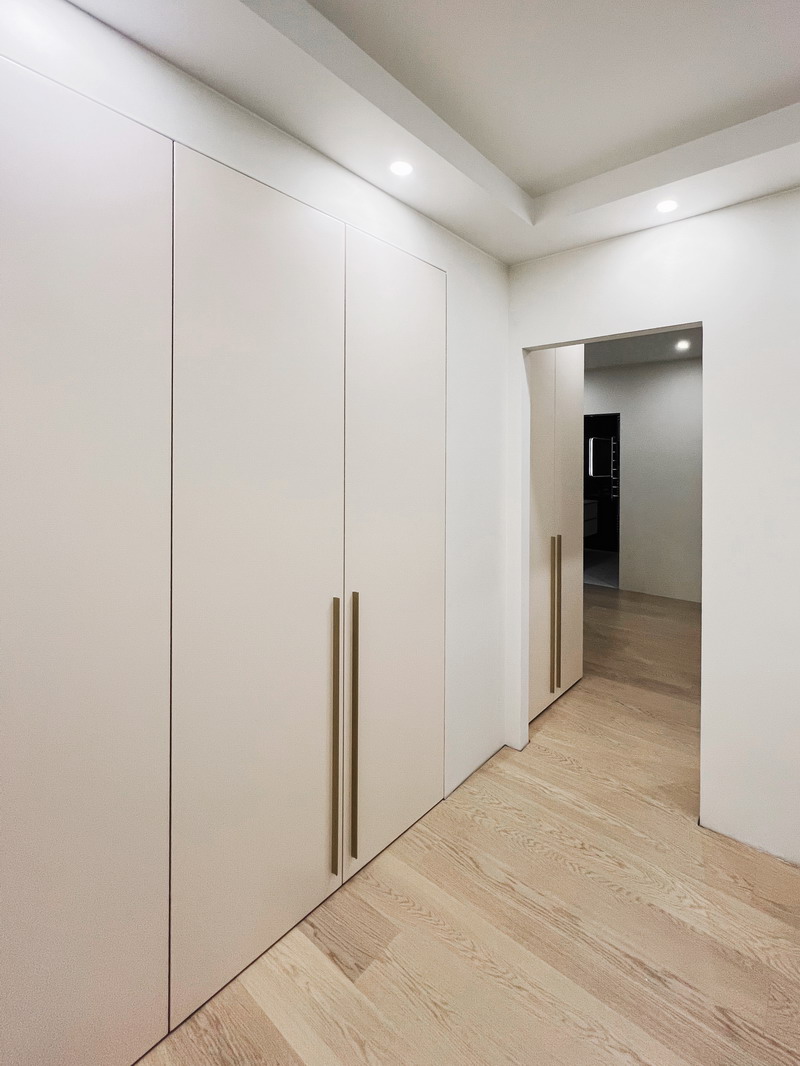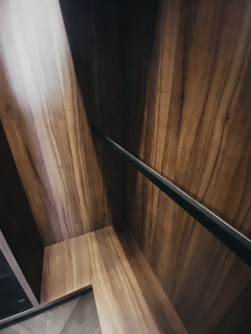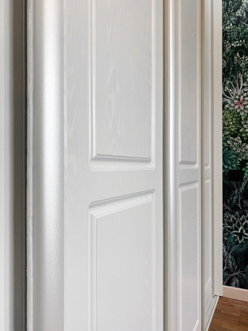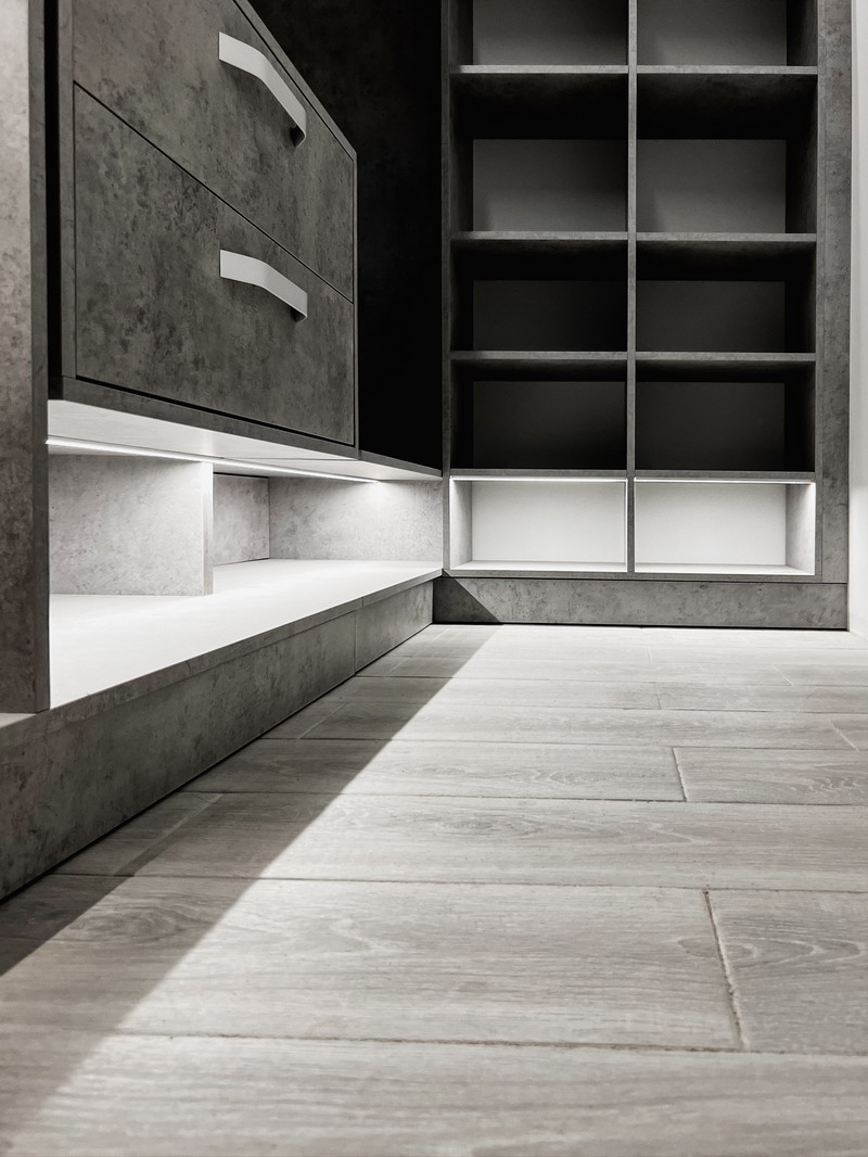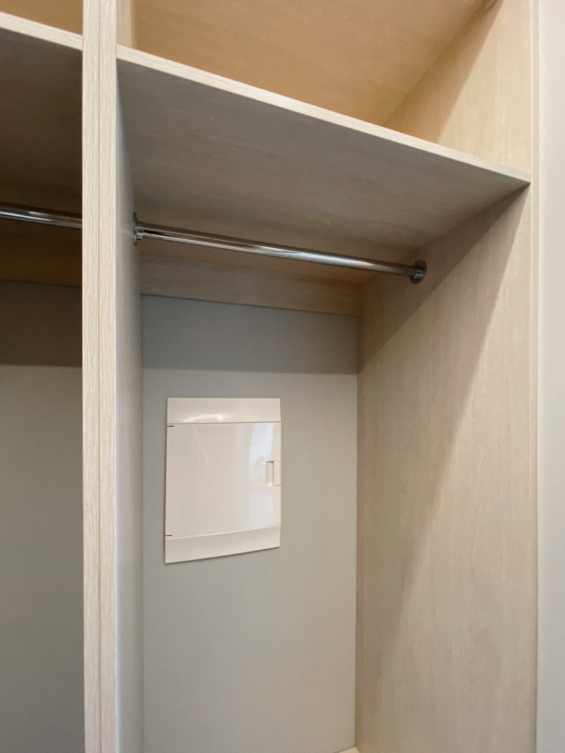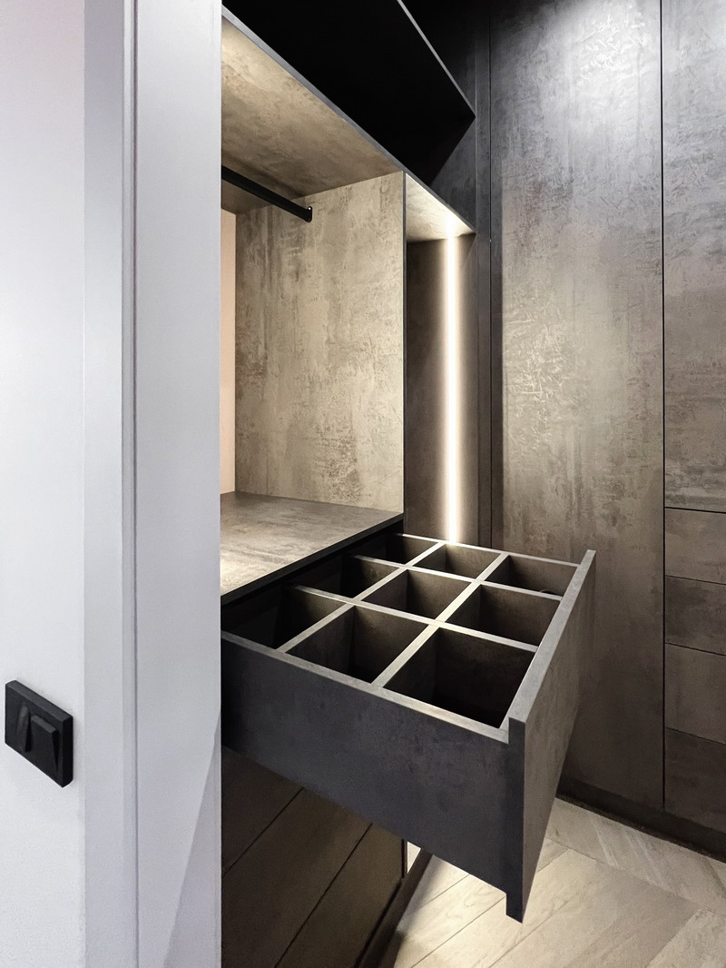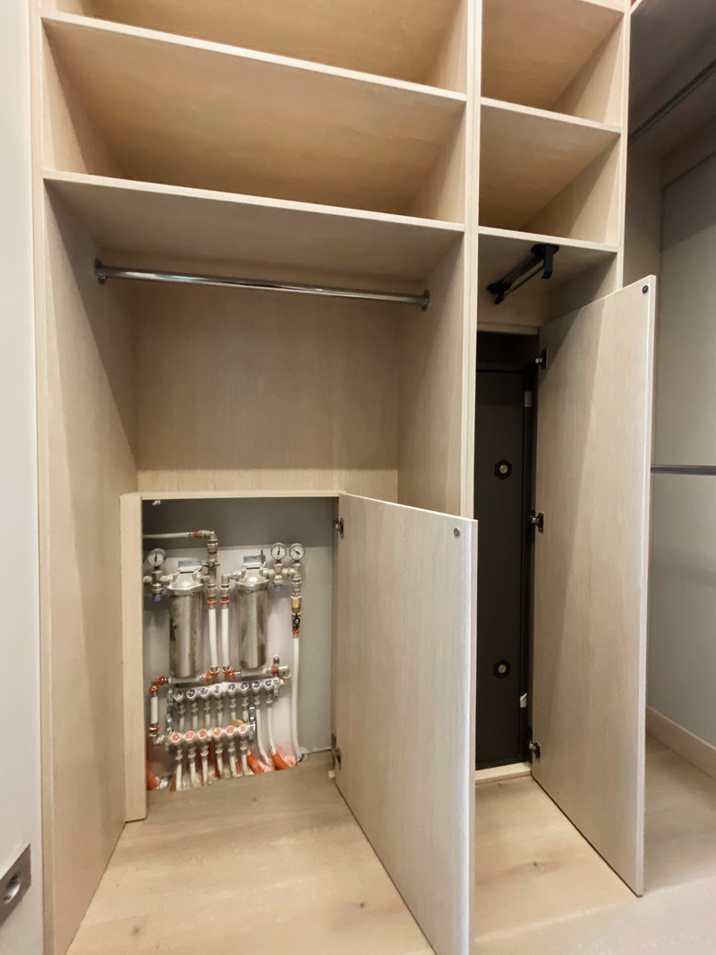 Дизайнер Светлана оказалась опытным высококвалифицированным специалистом, дала множество ценнейших советов, как сделать наши прихожую и гардеробную более удобными и функциональными. Она посоветовала нам развернуть наши комоды таким образом, чтобы к ним открывался доступ, не заходя во внутрь гардеробной, хозяйственный отдел (отсек для хранения стремянки, гладильной доски и т. п.) также оказался доступен, просто отдвигая дверь-купе. Также она предложила поставить незакрепленную тумбочку в прихожей, которую, при необходимости, можно достать оттуда для обеспечения доступа ко множеству счетчиков/датчиков/домофону и другим приборам. (Кстати, забегая вперед, скажу, что Дмитрий сделал идеальные замеры, таким образом, что корпус нашей прихожей виртуозно вписался в крохотном проеме между множеством этих приборов).