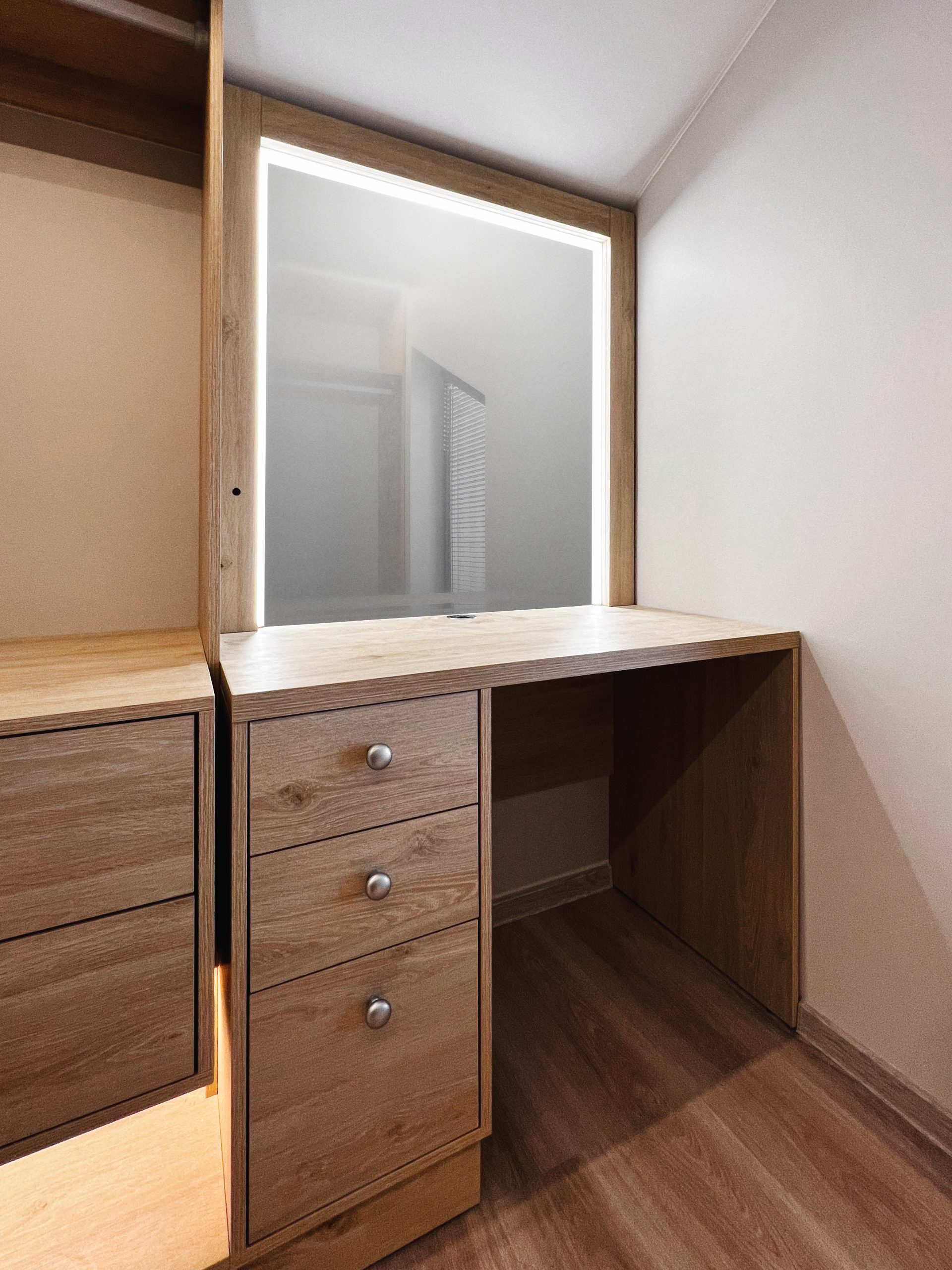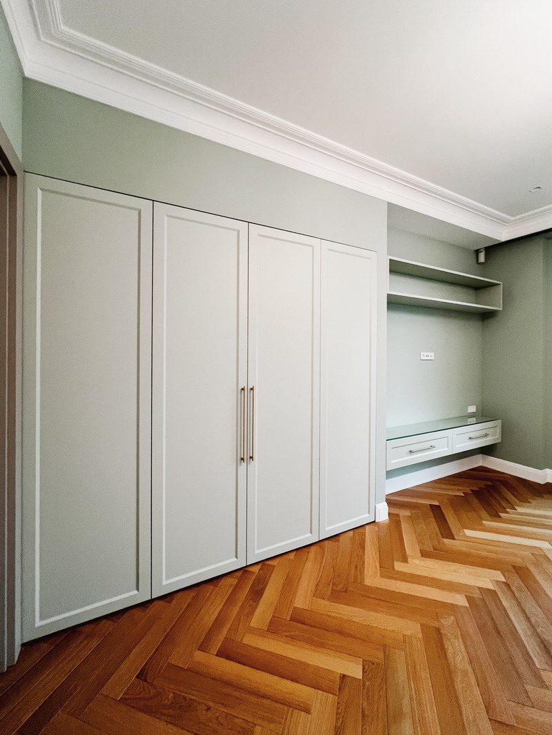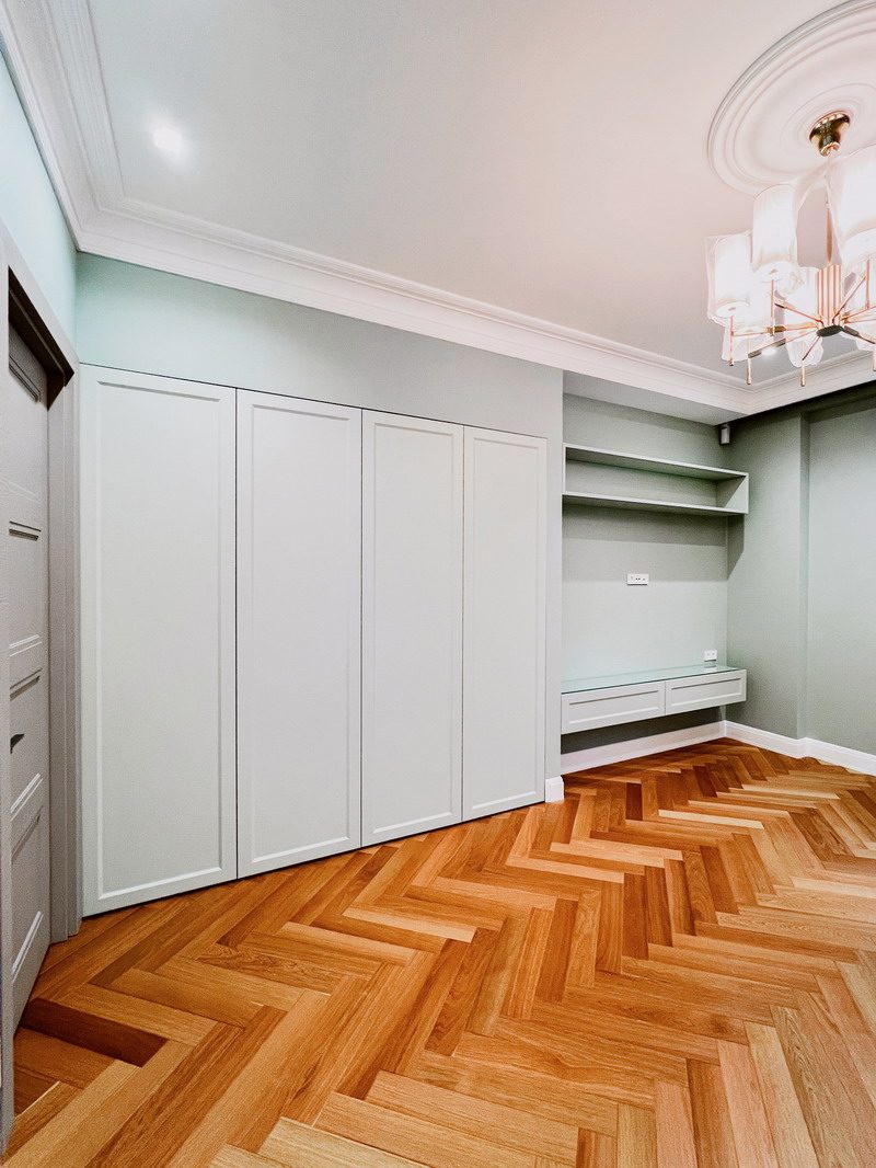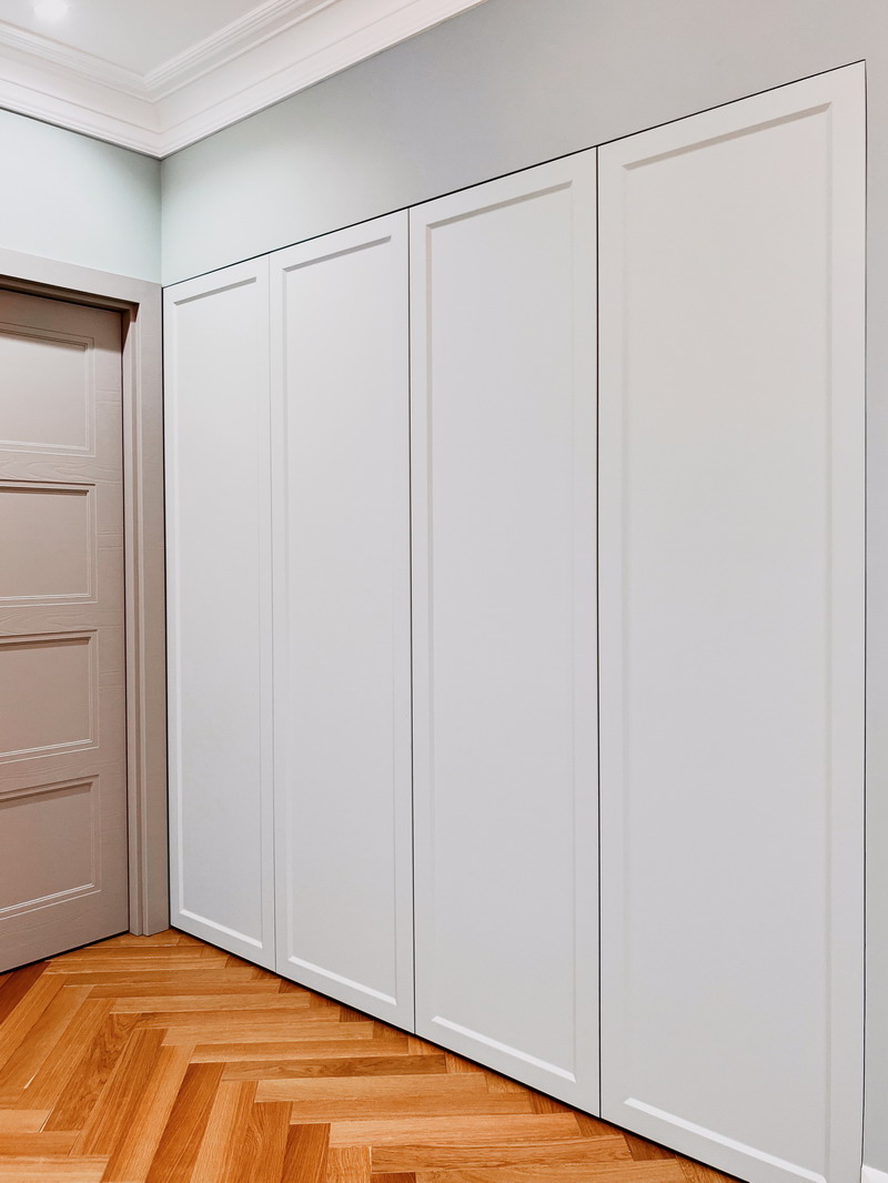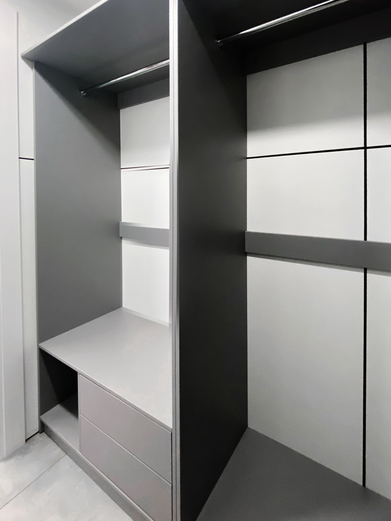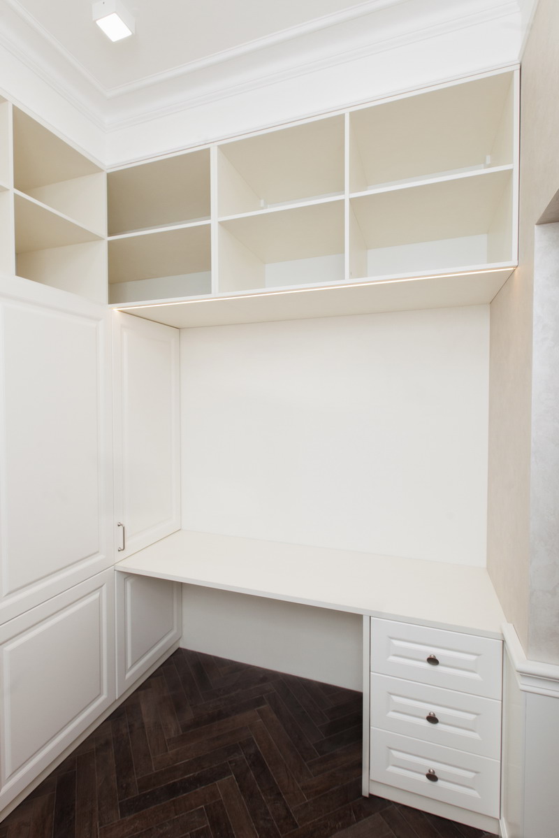 Мы приезжали в Спб всего лишь на месяц, поэтому мы попросили ребят уложиться в эти сроки, чтобы ехать домой со спокойным сердцем, что нашей дочери не придется жить в квартире с пустыми стенами и кучей вещей в середине комнаты)) И нам хотелось самим принять работу, не доверяя это совсем ещё юной дочери. Мы слабо верили в возможность построить два объекта (??) мебели за такие сжатые сроки, но они справились даже раньше, за 3 недели!