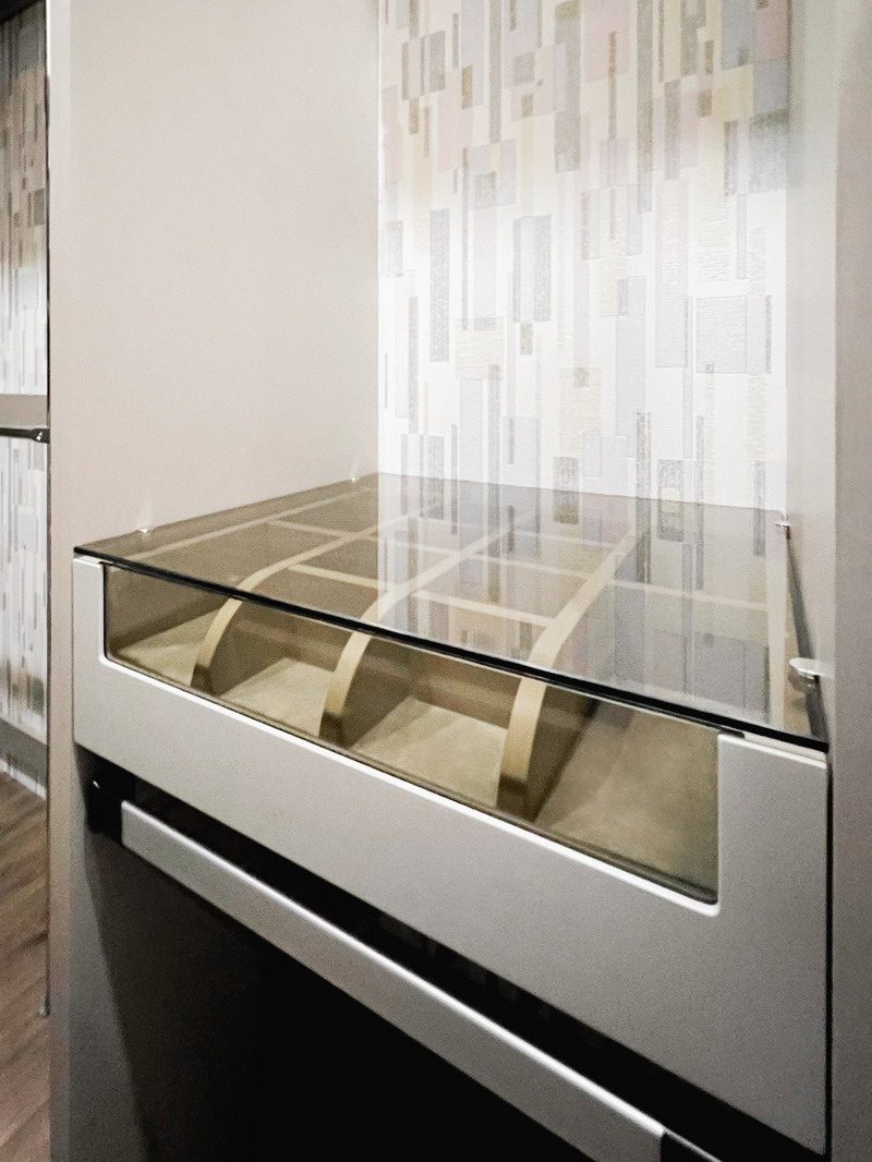 Для межкомнатных раздвижных перегородок можно использовать и двери-купе (2 рельса: верхний и нижний), и подвесные двери (1 рельс: только верхний). Лиговмебель использует в работе оба варианта механизмов, всё зависит от Вашего выбора и конструктивных особенностей помещения. Что касается стекла, то оно должно быть защищено, в целях безопасности, обязательно. Обеспечивается это, например, наклеиванием специальной плёнки на обратную сторону стекла. Плёнка может быть совершенно прозрачной и незаметной, а также матовой или многих других расцветок.