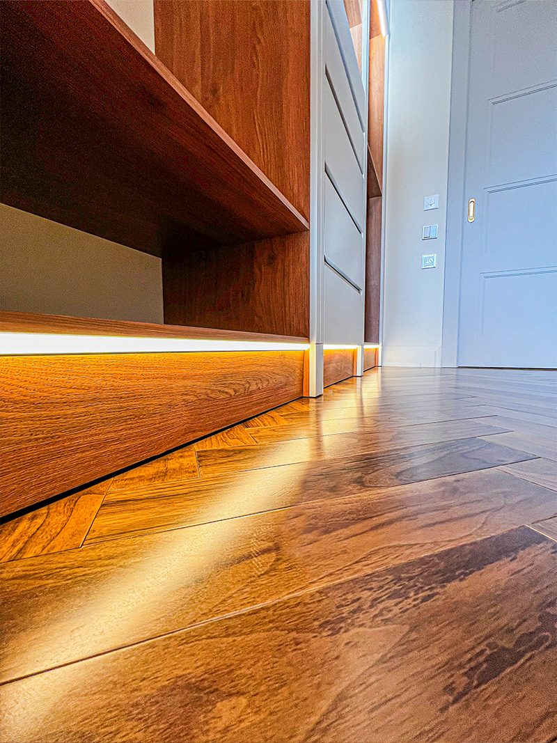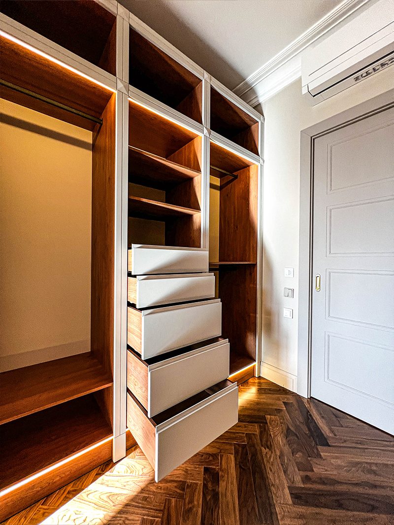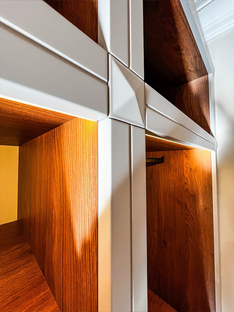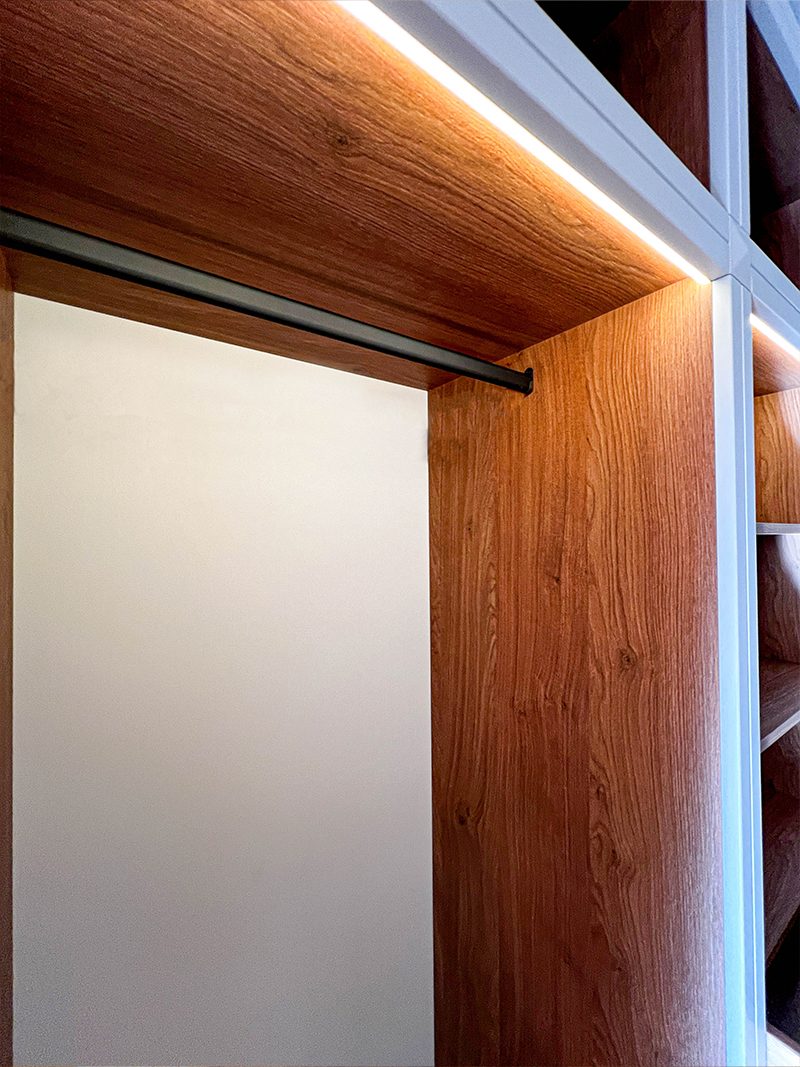 Гардеробная в современном стиле отличается функциональностью и лаконичностью. Такой дизайн может включать элементы минимализма, неоклассики, лофта и других стилей. Цветовая гамма включает светлые тона, а также есть подсветка, которая придают изысканности. Такая гардеробная функциональна, с удобными полками и вешалками.