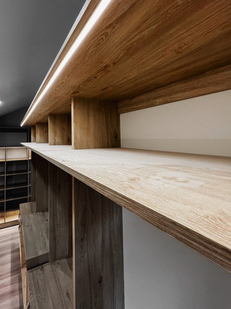 Гардеробная со скошенным потолком (в мансарде или под лестницей) требует индивидуального проектирования, чтобы превратить «мертвые зоны» под низким скатом в полезное пространство. Главная стратегия — размещение систем хранения по принципу каскада: от самых высоких секций для вешалок до низких выдвижных ящиков и обувниц.