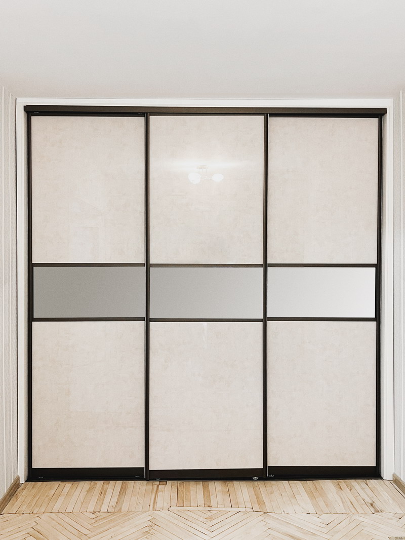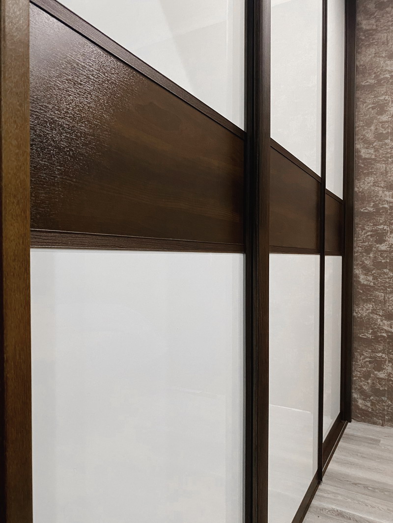 Для межкомнатных раздвижных перегородок можно использовать и двери-купе (2 рельса: верхний и нижний), и подвесные двери (1 рельс: только верхний). Лиговмебель использует в работе оба варианта механизмов, всё зависит от Вашего выбора и конструктивных особенностей помещения. Что касается стекла, то оно должно быть защищено, в целях безопасности, обязательно. Обеспечивается это, например, наклеиванием специальной плёнки на обратную сторону стекла. Плёнка может быть совершенно прозрачной и незаметной, а также матовой или многих других расцветок.