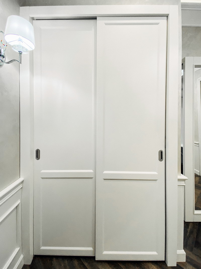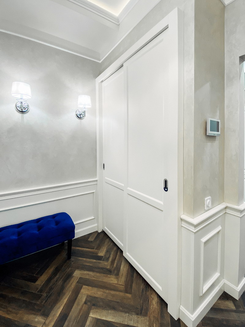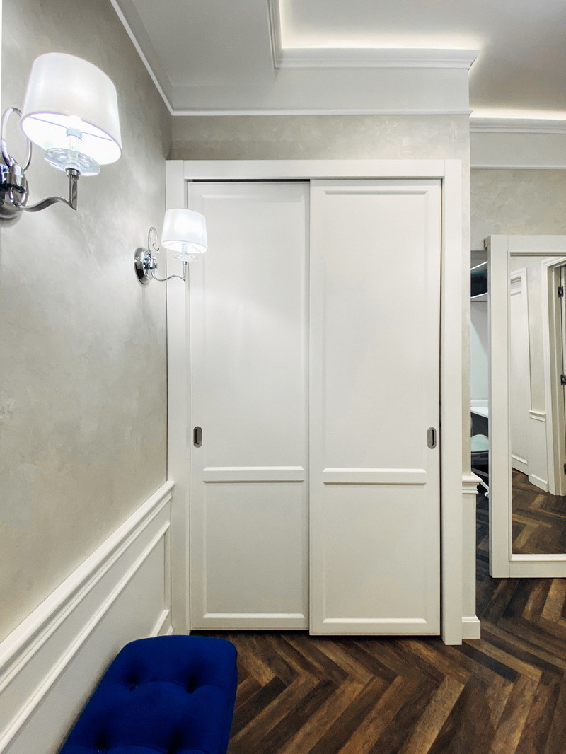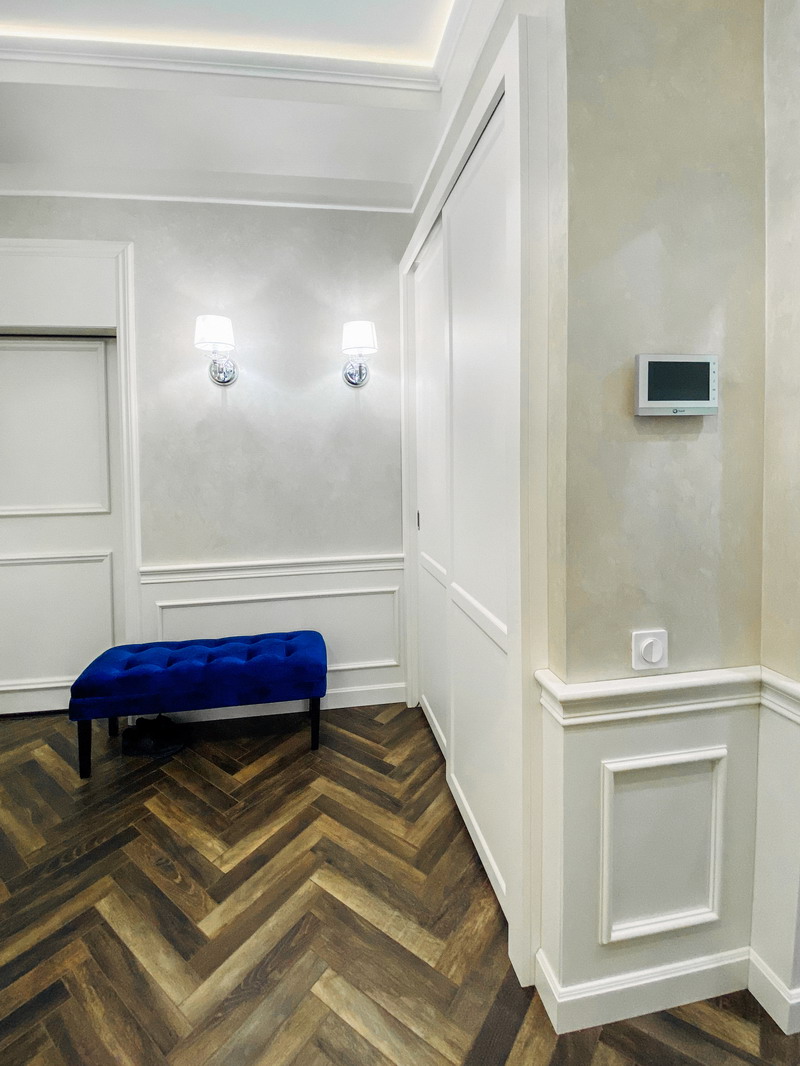 Дизайнер Светлана оказалась опытным высококвалифицированным специалистом, дала множество ценнейших советов, как сделать наши прихожую и гардеробную более удобными и функциональными. Она посоветовала нам развернуть наши комоды таким образом, чтобы к ним открывался доступ, не заходя во внутрь гардеробной, хозяйственный отдел (отсек для хранения стремянки, гладильной доски и т. п.) также оказался доступен, просто отдвигая дверь-купе. Также она предложила поставить незакрепленную тумбочку в прихожей, которую, при необходимости, можно достать оттуда для обеспечения доступа ко множеству счетчиков/датчиков/домофону и другим приборам. (Кстати, забегая вперед, скажу, что Дмитрий сделал идеальные замеры, таким образом, что корпус нашей прихожей виртуозно вписался в крохотном проеме между множеством этих приборов).